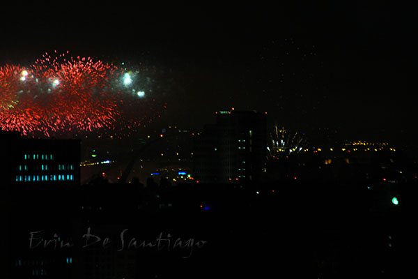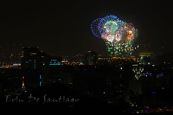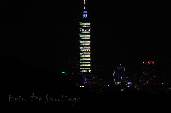 We got settled in and camera ready, but I had a horrible time with a long exposure at the tripod was not tall enough and the winds were pretty bad. It was moving my camera on the block wall so most of my shots came out terrible until I went to a fast shutter speed. Unfortunately, the two minute show flew by and the sadly, the fireworks were not as spectacular as we had hoped. We had read the star of the show was to be a dragon going up the side of Taipei 101, but from our vantage point, it was not that impressive. In spite of that, we did enjoy seeing all of Taipei lit up as fireworks went off all around us.